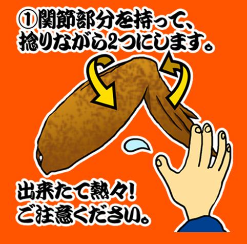 必読★酔っ手羽名物★伝説の手羽先の愉しみ方【その1】関節部分をもって、ひねりながら2つにします。出来立て熱々!ご注意下さい。
